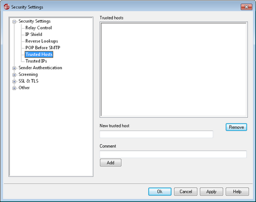 On various dialogs and security features throughout MDaemon you will see options that allow you to choose whether or not "Trusted Hosts" or "Trusted Domains" will be exceptions to or exempt from those options. The hosts you list on this screen are the ones to which those options refer.