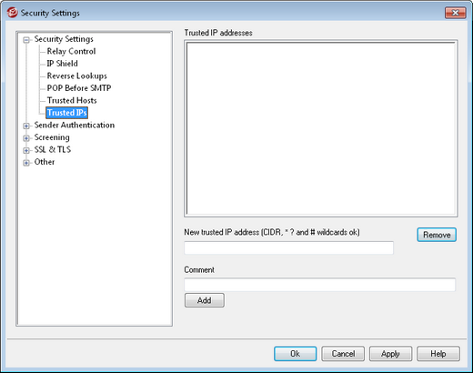 On various dialogs and security features throughout MDaemon you will see options that allow you to choose whether or not "Trusted IPs" will be exceptions to or exempt from those options. The IP addresses you list on this screen are the ones to which those options refer.