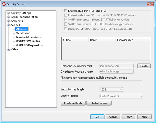 MDaemon does not support different certificates for multiple domains. All mail domains must share a single certificate. If you have more than one domain then enter those domain names under the option, Alternative host names (separate multiple entries with a comma) outlined below. |