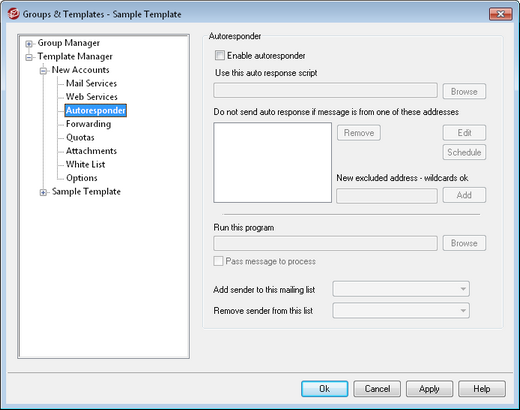 The options on this template screen correspond to the options located on the Account Editor's Autoresponder screen. When a template is set to control this screen, it will control the Autoresponder options for any account belonging to a Group that utilizes the template.