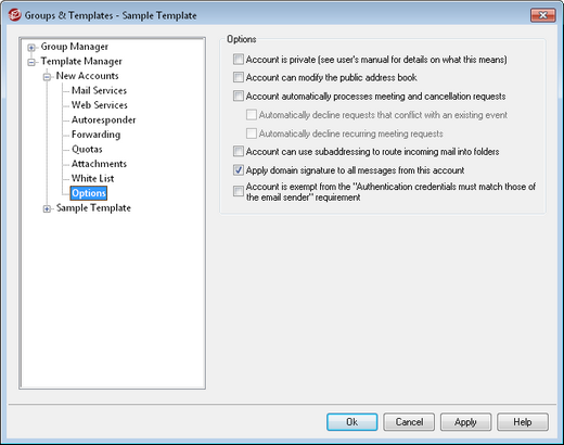 When there is a Domain Signature for the domain to which accounts governed by this template belong, this option causes it to be added to all emails sent by those accounts.
