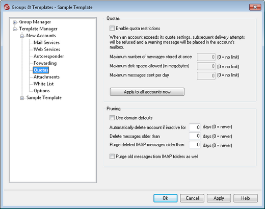 Check this box if you wish to specify a maximum number of messages that accounts controlled by this template can store, set a maximum amount of disk space that the accounts can use (including any file attachments in each account's Documents folder), or designate a maximum number of messages that the accounts can send via SMTP per day. If a mail delivery is attempted that would exceed the maximum message or disk space limitations, the message will be refused and an appropriate warning message will be placed in the user's mailbox. If a MultiPOP collection would exceed the account's maximum a similar warning is issued and the account's MultiPOP entries are automatically switched off (but not removed from the database).