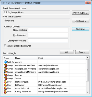 Select these object types Click Object Types... to select the object types that you wish to search for the groups or users you wish to add. You can select: Built-In, Groups, and Users. From these locations Click Locations... to select the domains that you wish to search. You can select all of your MDaemon domains or specific domains. Common Queries Use the options in this section to narrow your search by specifying all or part of the user's name, email address, or the contents of the account's Description. Leave these fields blank if you want the search results to contain every group and user that matches the Object Types and Locations specified above. Include Disabled Accounts Check this box if you wish to include disabled accounts in your search. Find Now After you have specified all of your search criteria, click Find Now to perform the search. Search Results After performing the search, select any desired groups or users in the Search Results and click OK to add them to the ACL. To select more than one group or user, hold down the Ctrl key when selecting them. |