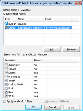 Object Name This is the name of the object or folder to which the ACL permissions will apply. Group or user names These are the groups or users to which some level of access permissions may have been granted. Select a group or user to display its permissions in the Permissions for <group or user> window below. Check the box next to any access permission that you wish to grant to the group or user. Add To grant access permissions to a group or user not listed above, click Add. Remove To remove a group or user, select its entry in the list above and click Remove. Permissions for <group or user> Check the box next to any access permission that you wish to grant to the group or user selected above. You can grant the following access control permissions: Administer – user can administer the ACL for this folder. Create – user can create sub-folders within this folder. Delete – user can delete items from this folder. Mark Read – user can change the read/unread status of messages in this folder. Insert – user can append and copy items into this folder. Lookup Folder – user can see this folder in his personal list of IMAP folders. Post – user can send mail directly to this folder (if folder allows). Read – user can open this folder and view its contents. Write – user can change flags on messages in this folder. Apply to all child folders Check this box if you wish to apply this folder's access control permissions to any sub-folders it currently contains. This will add the folder's user and group permissions to the child folders, replacing them when there are any conflicts. It will not, however, delete any other user or group permissions that currently have access to those folders. Example, The parent folder grants certain permissions to User_A and User_B. The child folder grants permissions to User_B and User_C. This option will add User_A permissions to the child folder, replace the child folder's User_B permissions with those from the parent folder, and do nothing to the User_C permissions. Therefore the child folder will then have User_A, User_B, and User_C permissions. Overwrite child folders Check this box if you wish to replace all child folder access permissions with the parent folder's current permissions. The child folder permissions will then be identical to the parent folder. |