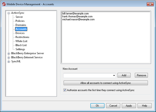 To manually authorize an account to use ActiveSync, choose the account from the New account drop-down list and click Add. To remove an account, select in from the list and click Remove.