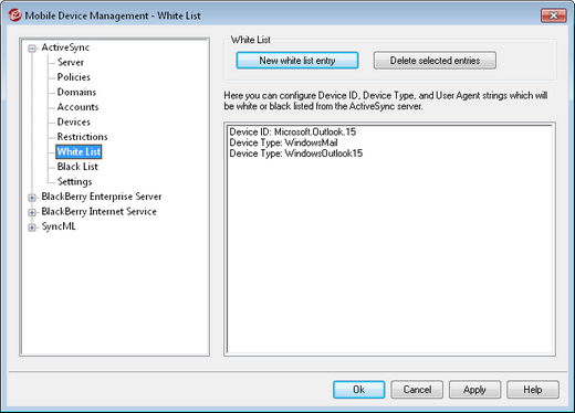 To add an entry to the list, click New white list entry, specify the device info, and click Ok. You can obtain the device info from the device itself or from the ActiveSync log files if the device has connected to MDaemon's ActiveSync server.