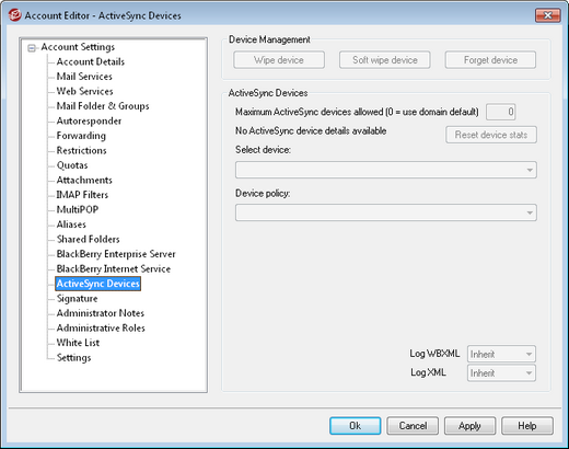 Use the Log WBXML and Log XML options if you wish to log this data for the account's devices, which can sometimes be useful for debugging purposes. There are corresponding options on the Mobile Device Management dialog and the Domain Manager for setting these options globally and per domain, respectively. The global option is disabled by default, and the domain and account options are set to Inherit, which means that they take their setting from the parent option. WBXML and XML logging are therefore globally disabled by default.