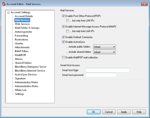 The options on this screen govern which mail services the account is allowed to use: POP, IMAP, ActiveSync, MultiPOP, and Outlook Connector. Email access via WorldClient is controlled from the Web Services screen. It also contains options for specifying optional Smart Host Access credentials for the account.