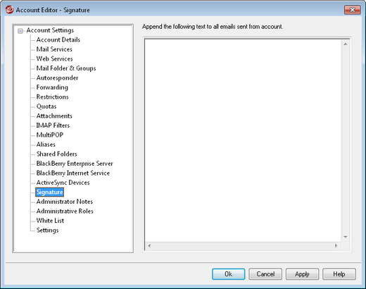 Use this screen to designate a signature that will be appended to the bottom of every email that the account sends. This signature is added in addition to any other signatures or footers added by other options, such as the signature option included in WorldClient and other mail clients, the Default and Domain signature options, and Mailing List footers. Default/Domain Signatures and Mailing List footers are always added below Account Signatures.