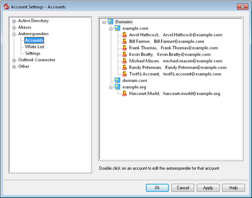 This area lists all available local mailboxes that can host an autoresponder. Double-click an account in this list to open its corresponding Autoresponder screen, which is used to configure an autoresponder for that account.