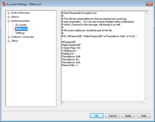 Use Autoresponder » White List to configure global exceptions to autoresponders. Messages from entries in this list will not receive any autoresponders. Both email addresses and header/value pairs can be included in the list. Enter one address or header/value pair per line. Wildcards are permitted.