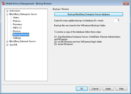Each night the BlackBerry Enterprise Server database is backed up and the backup files are stored in the \MDaemon\Backup\ folder. This option determines the number of backup files that will be saved. When the limit is reached, the oldest file will be deleted when a new backup file is created. Use "0" in this option if you do not wish to do automatic nightly backups.