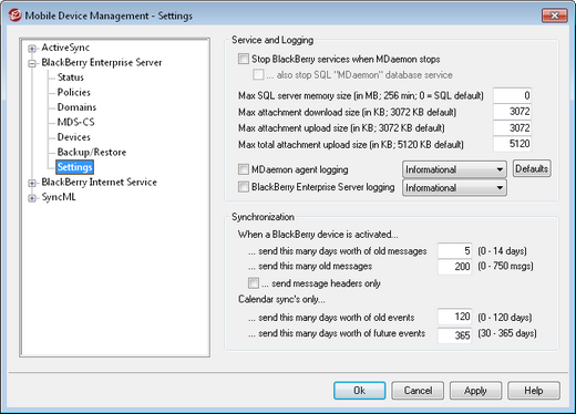 With this screen you can set the BlackBerry Enterprise Server services to stop when MDaemon stops, configure logging options, and set several synchronization options for email and calendar data.