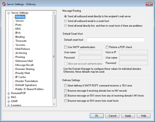 Select this option if you want outbound email, regardless of its destination domain, to be spooled to another host or server for routed delivery. If selected, outbound email will be sent to the Default Smart Host specified below. Typically, this feature is useful during high volume periods when direct message delivery would result in an excessive taxation of server resources. If a message cannot be delivered to the designated server then it will be moved into the retry system and MDaemon will continue to attempt to deliver it according to the parameters and time intervals that you set on the Retry Queue screen of the Mail Queues dialog.