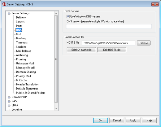 You must enter the complete path and filename rather than just the filename. MDaemon will attempt to use the following value as the default location of this file: [drive]:\windows\system32\drivers\etc\hosts The HOSTS file is a Windows file that contains the A-record or primary IP address for domain names. MDaemon also allows you to specify MX-record IP addresses within a file called MXCACHE.DAT. This file can be found within the MDaemon\APP\ subdirectory. Load the MXCACHE.DAT file into a text editor and read the comments at the top of the file for more information. |