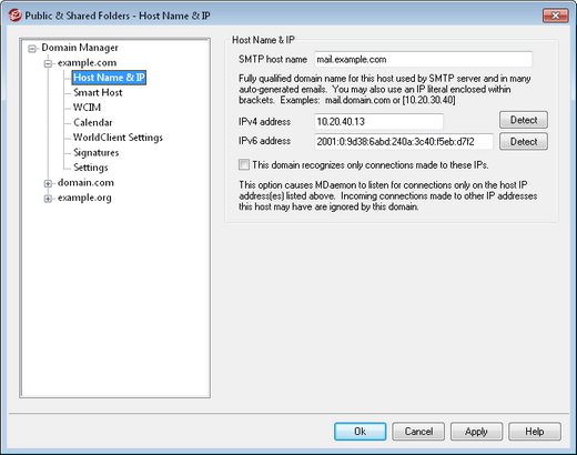 Enter the IPv4 and IPv6 addresses to associate with this domain. If an IP address is missing MDaemon will automatically try to detect a suitable address for use.