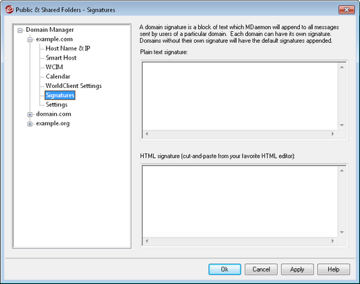 Use this screen to append a signature to all messages sent by this domain's users. If no signature is specified here then the Default Signature will be appended instead. Signatures are added to the bottom of messages, except for mailing list messages using a footer, in which case the footer is added below the signature. You can also use the Account Editor's Signature feature to add individual signatures for each Account. Account signatures are added just before Default or Domain Signatures.
