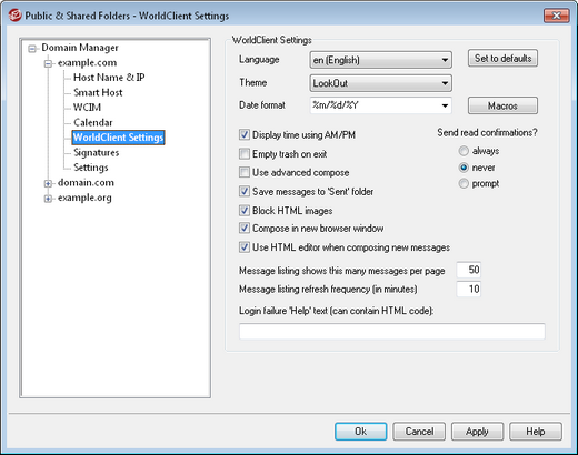 This screen governs various WorldClient client-level options for this domain. When a user signs in to WorldClient, these options govern how WorldClient initially works for that user. Many of these settings can then be customized by the user via the Options pages within WorldClient. The default settings of this screen are determined by the WorldClient (web mail) » Settings screen located on the Web & IM Services dialog.