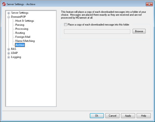 This is a safety feature to ensure that you don't lose any mail due to unforeseen parsing or other errors that might occur when downloading mail in bulk quantities. Check this box if you wish to save a copy of each downloaded message into the folder that you specify. These copies are placed in the folder exactly as they are received and are not processed by MDaemon at all.