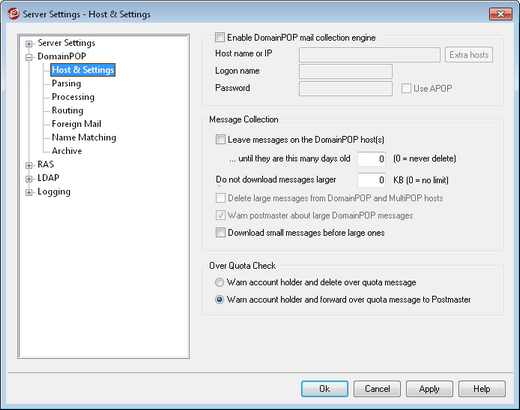 If selected, MDaemon will use the setting provided on this screen to collect mail from a DomainPOP mail host for local redistribution.