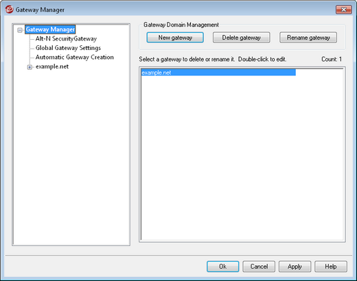 The navigation pane on the left side of this dialog contains the list of your gateways, with links to each screen used for configuring the various gateway-specific settings. It also provides access to the Global Gateway Settings and Automatic Gateway Creation screens. The list on the right is used for deleting and renaming domains. You can double-click a gateway in this list to switch to the gateway editor for configuring its settings.