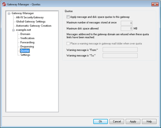 Enable this option if you wish to designate a maximum number of messages allowed to be stored for the domain or a maximum amount of disk space (in kilobytes) that it can use. This includes any decoded file attachments in its Files directory. When a quota is reached, any further incoming messages addressed to the domain will be refused.