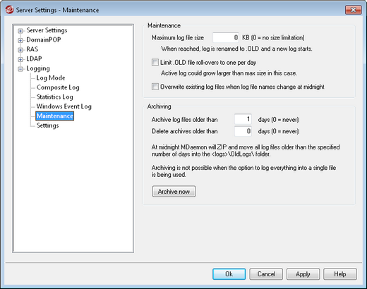 Click this button to archive old log files immediately rather than waiting for MDaemon to archive them automatically at midnight.