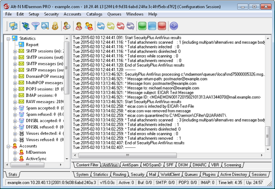AntiVirus — if you have installed SecurityPlus for MDaemon, then all AntiVirus operations are listed on this tab.When a message is scanned for viruses, the relevant information related to that message and the action taken is logged here.
