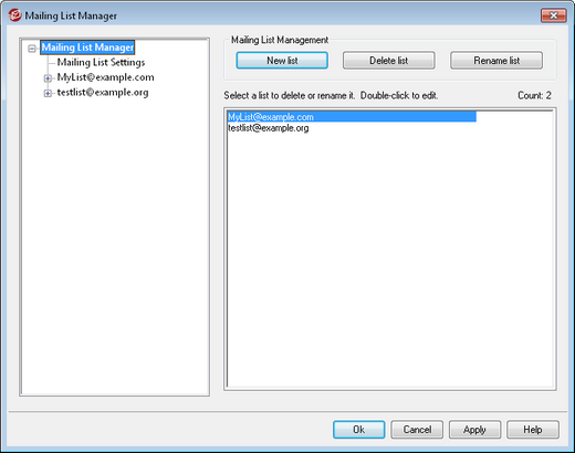 To create a new mailing list, click New list to open the Mailing List Email Address dialog. Create a mailbox name and select a domain, such as "MyList" and "example.com" respectively. This will be the mailing list's email address (i.e. MyList@example.com). Messages sent to this address will be distributed to members of the list, based on the list's particular settings. Click OK to create the list. After creating the list you can double-click its entry to configure its settings and add members. Note: List names cannot contain " ! " or " | "