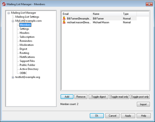 This screen displays the email addresses and names of all members currently subscribed to the list. Each member's entry also states its "type" of membership: normal, digest, read only, or post only. To edit a member's settings, double-click the member's entry.