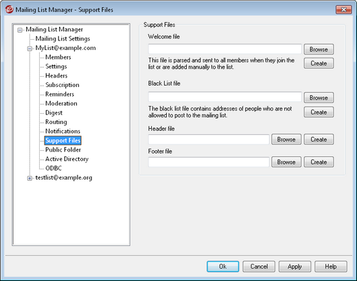 The contents of the files specified here will be used as the header and/or footer file for list messages.