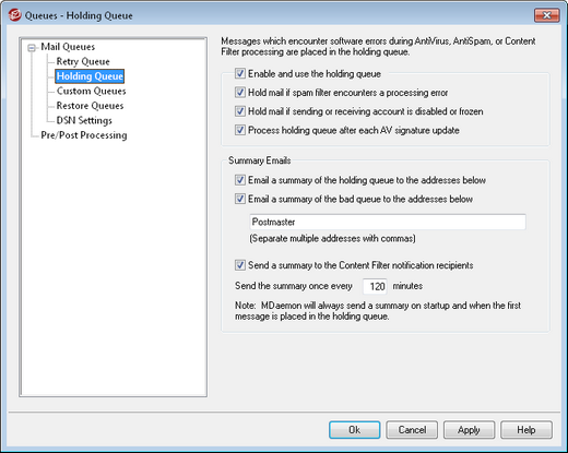 Click this check box to activate the holding queue. Messages that cause software exceptions during AntiVirus and Content Filter processing will be moved to this queue whenever an error occurs.