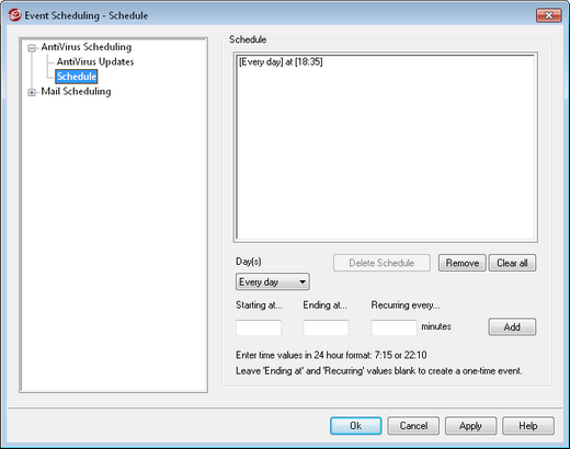 This is the time interval at which SecurityPlus will check for updates between the designated Starting at... and Ending at... times. Leave this option blank if you wish it to be a single event rather than recurring event.