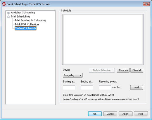 Depending on your needs, it may be sufficient to use the simple scheduling options on the Mail Sending & Collecting screen to control mail processing intervals. For example, it is pointless to make a specific schedule with events for every minute of every day when you can simply set the slider bar on Mail Sending & Collecting to one minute intervals and accomplish the same thing. On the other hand, if you want the processing intervals to be more than an hour apart, or only on certain days, then you can use some combination of the scheduling options and mail specific times. |