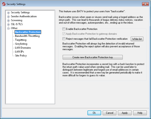Click this button to open the Backscatter Protection white list. Use this list to designate any IP addresses or domains that you wish to exempt from Backscatter Protection.