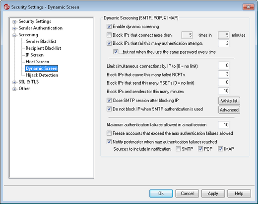 Click this check box to enable dynamic screening. This option screens SMTP, POP3, and IMAP connections.