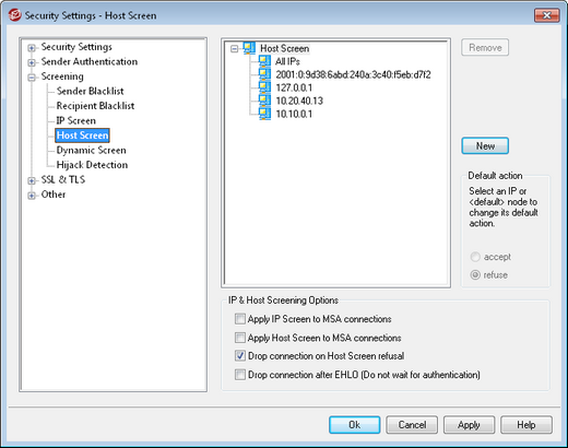 The Host Screen is located at: Security » Security Settings » Screening. It is used to define which remote hosts will be allowed to connect to your local IP addresses. You may specify a list of hosts and configure the server to allow only connections from those hosts, or you can configure it to refuse connections from the listed hosts. Host screening compares the EHLO and PTR values determined during the SMTP session with the values specified here.