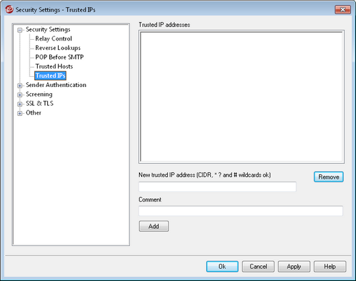On various dialogs and security features throughout MDaemon you will see options that allow you to choose whether or not "Trusted IPs" will be exceptions to or exempt from those options. The IP addresses you list on this screen are the ones to which those options refer.