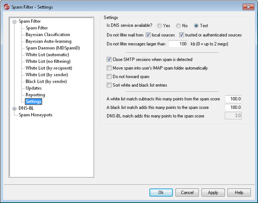 If you are using DNS Black Lists then you can use this option to specify a value that will be added to a message's spam score when a DNS-BL match is found. Sometimes the Spam Filter's heuristic examination of a message may not score it high enough to be considered spam, but a DNS-BL lookup may show that it probably is spam. Adding this value to the spam score of these messages can help to reduce the number of spam messages that manage to slip through undetected by the Spam Filter.