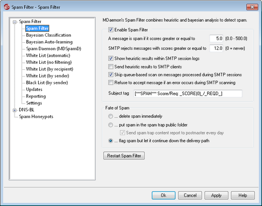 Check this box to activate the heuristic message-scoring, spam filtering system. None of the other Spam Filter options on this screen will be available until this option is enabled.