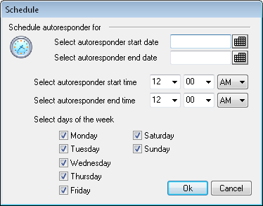 Click this button to open the Schedule dialog on which you can set a start and end date and time for the Autoresponder to be active. Leave the Schedule blank if you want the Autoresponder to be active continually.