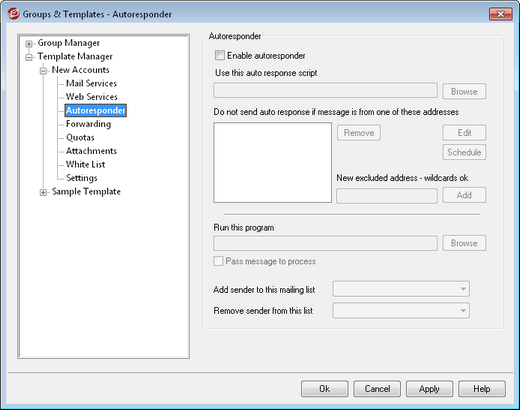 The options on this template screen correspond to the options located on the Account Editor's Autoresponder screen. When a template is set to control this screen, it will control the Autoresponder options for any account belonging to a Group that utilizes the template.