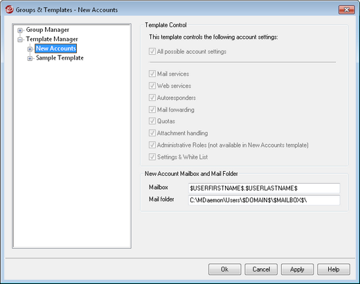 Use this field to control the default Mail folder that will be used for new accounts. Each account's Mail folder is where its email messages will be stored on the server. For example, "...\$DOMAIN$\$MAILBOX$\" would create the path, "...\example.com\michael.mason\" for the user, "michael.mason@example.com".