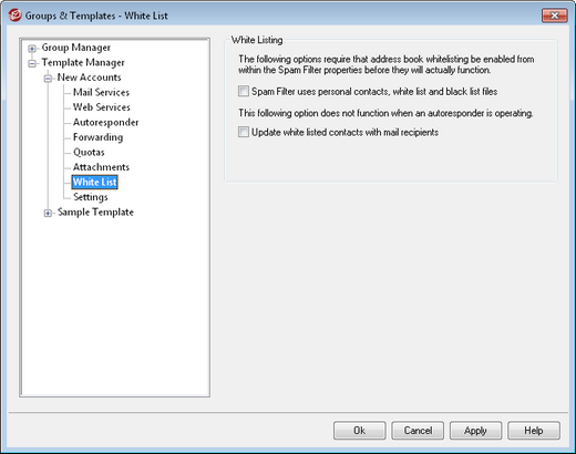 The options on this template screen correspond to the settings located on the Account Editor's White List screen. When a template is set to control this screen, it will control the White List screen settings for any account belonging to a Group that utilizes the template.