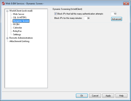Use this option if you wish to temporarily block IP addresses that fail a WorldClient authentication attempt a specified number of times. This can help prevent attempts to "hack" a user account and falsely authenticate a session. This option monitors only WorldClient connections.