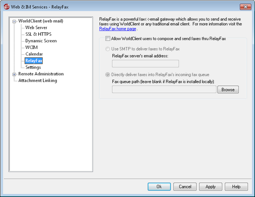 Click this option to integrate RelayFax with WorldClient. When active it will cause a "Compose Fax" control and other fax related features to appear on the WorldClient pages.