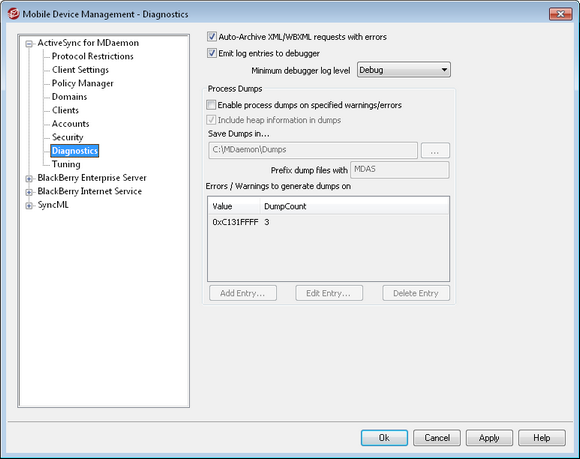 Enable this option if you want the ActiveSync service to generate process dumps whenever a specific warning or error occurs that you have designated below.