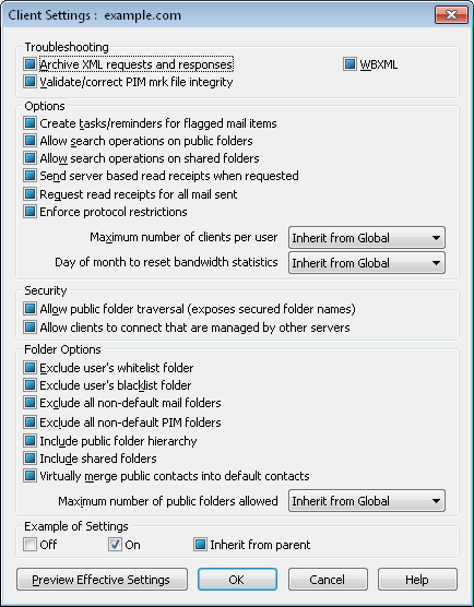 By default all of the options on this screen are set to "Inherit from parent," which means that each option will take its setting from the corresponding option on the global Client Settings screen. Similarly, the client settings screens for this domain's Accounts will inherit their settings from this screen, since the domain's Client Settings screen is their parent screen. Any changes made to the options on this screen will be reflected on those screens. Below that, individual clients also have settings screens that inherit their settings from the account-level settings. This configuration makes it possible for you to make changes to all of a domain's accounts and clients simply by making changes to this one screen, while also making it possible for you to override those settings for any account or client as needed. Troubleshooting Archive [XML | WBXML] requests and responses Use the Archive XML... and WBXML options if you wish to save this data, which can sometimes be useful for debugging purposes. The global options are disabled by default. Validate/correct PIM mrk file integrity This option runs a validation and correction process on the client's PIM data to look for known issues that could prevent it from syncing correctly, such as duplicate iCal UIDs or empty required fields. The global option is disabled by default. Options Create Tasks/Reminders for flagged mail items This option makes it possible for MDaemon to remind the user about flagged items, by creating a task item for each flagged email. This is disabled by default. Allow search operations on Public Folders Allows the client to search the Public Folders to which it has access. This is allowed by default. Allow search operations on Shared Folders Allows the client to search the Shared Folders to which it has access. This is allowed by default. Send server based read receipts when requested. Enable this option if you want the server to support read confirmation requests and issue a read receipt when a message is flagged as read by a client. This is disabled by default. Request read receipts for all mail sent Enable this option if you want the server to request read confirmation for all mail sent by a client. This is disabled by default. Enforce protocol restrictions Enable this option if you wish to deny connections from any client that attempts to use a protocol other than the the Allowed Protocol Versions specified for the client. By default this option is disabled, which means that protocol restrictions do not prevent a client from using a different protocol; they simply tell the client which protocols to use. If a client attempts to use a restricted protocol anyway, MDaemon will still allow the connection. Maximum number of clients per user If you wish to limit the number of ActiveSync clients or devices that can be associated with an MDaemon account, specify the desired number in this option. The global option is set to "unlimited" by default. This option is available on the Global, Domain, and Account client settings screens, not the individual Clients screens. Day of month to reset bandwidth statistics Use this option if you wish to reset the bandwidth usage statistics for ActiveSync devices on a specific day of each month. The reset event takes place as part of the normal nightly maintenance process and is logged to the System log like other maintenance routines. The global option is set to "0 (Never)" by default, meaning the usage stats will never be reset. Set the child options to a different day if, for example, you want the reset day to coincide with a user or client's wireless carrier billing reset date. Security Allow Public Folder traversal (exposes secured folder names) By default, in order for a client to sync/access a public subfolder, the account must have Lookup permission for both the subfolder (i.e. child folder) and all parent public folders above it. If the account does not have permission to see the parent folders then it cannot see the child folder either, even if the account has permission to do so. Enable this option if you wish to allow the client to access these child folders. Note: enabling this option must necessarily reveal the names of the parent folders to the client, which could be deemed a security risk. This option is disabled by default. Allow clients to connect that are managed by other servers By default, when the ActiveSync server sends provisioning data/policy specifics to a client and it reports that it is also managed by another ActiveSync server, the client will still be allowed to connect to MDaemon. In this circumstance, however, there is no way to ensure that your policy specifics will be applied where they conflict with the other ActiveSync server's policy. Generally clients default to using the most restrictive option where policies conflict. Disable this option if you do not wish to allows those clients to connect. Folder Options Exclude user's [whitelist/blacklist] folder By default the user's whitelist and blacklist contact folders are not synced with devices. They are generally only used by MDaemon to help with automatic spam prevention. For that reason they do not need to be displayed on devices as contacts. Exclude all non-default mail folders By default all user-created and default mail folders can be synced with the device. Enable this option if you wish to allow only the default mail folders to be synced, i.e. the Inbox, Sent Items, Deleted Items, Drafts, and so on. No user-created folders will be included. This option is disabled by default. Exclude all non-default PIM folders By default all of the user's PIM folders (i.e. contacts, calendar, notes, tasks, etc.) will be synced with the device. Enable this option if you wish to allow only the default PIM folders to be synced. For example, if this option is enabled and a user has multiple calendar folders, only the default calendar will be synced. This option is disabled by default. Include Public Folder hierarchy Ch