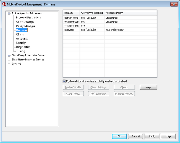 Domains with the ActiveSync Enabled column set to Yes/No (Default) get their ActiveSync setting from state of the option: Enable all domains unless explicitly enabled or disabled. When that option is enabled, all domains will have ActiveSync enabled by default. When it is disabled, ActiveSync will be disabled by default. Setting a domain specifically to Yes or No will override the default setting.