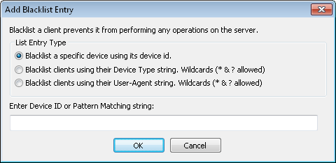 Use this option to prevent a specific Device Type, Device ID, or User Agent from accessing MDaemon's ActiveSync server.